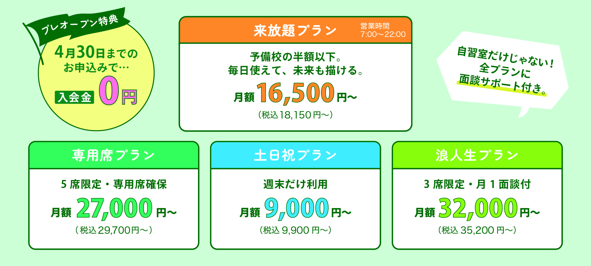 - 自習室のため勉強指導は行いません。ただし、勉強内容や方法の相談にはいつでも乗ります。